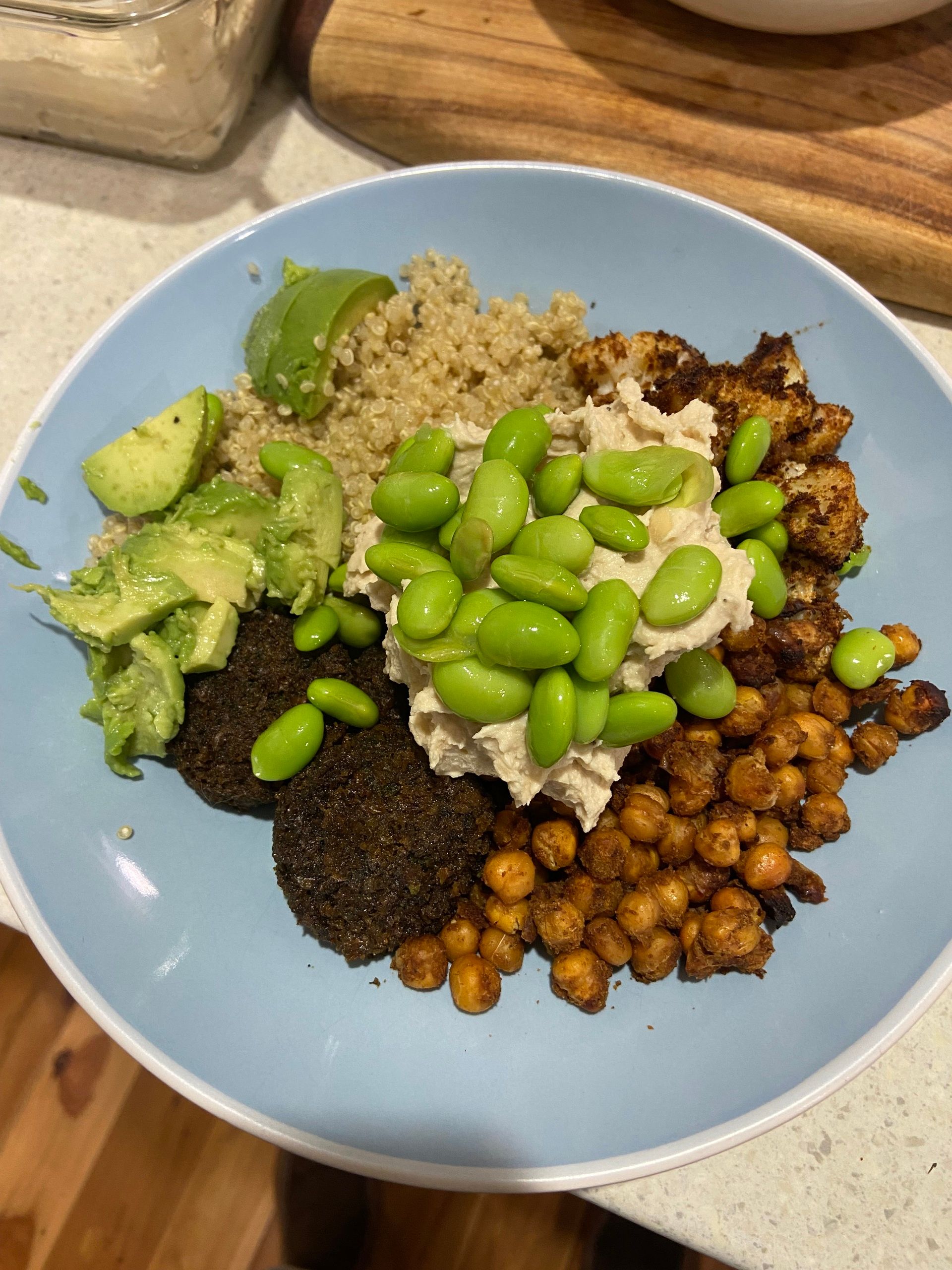 When ready to serve, just put everything on the bench and let people build their own bowl. I sometimes add a piece of salmon, or some store-bought falafel rolls to the mix. And I then build an another bowl to take for lunch the next day. Yum!