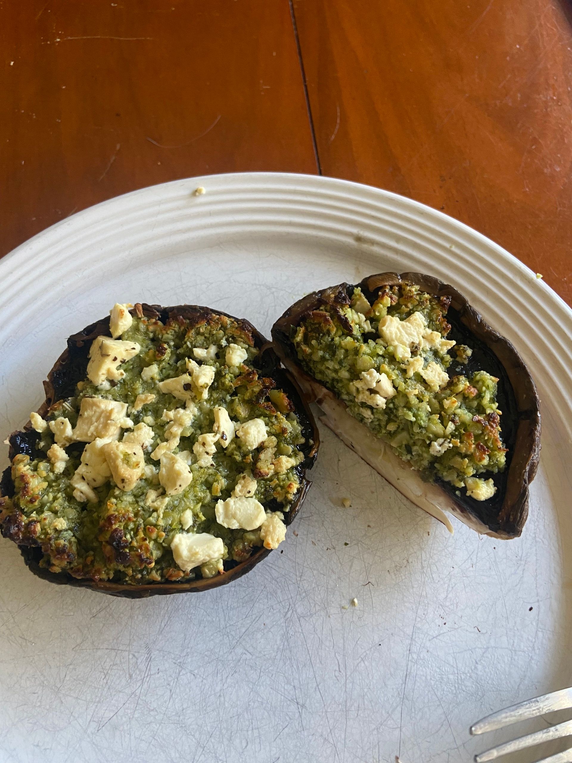 Drizzle 2 portobello mushrooms with extra virgin olive oil.